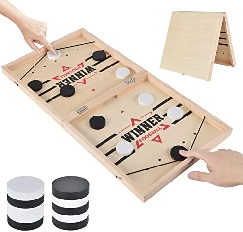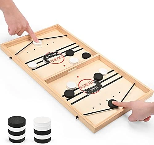 - √EASY TO LEARN HOW TO PLAY – Each team has 5 pieces. Hold your finger on the chess piece, pull it back by the rubber band, release your finger, and pop it forward. Sling all of the pucks to the opposite side and get the win!