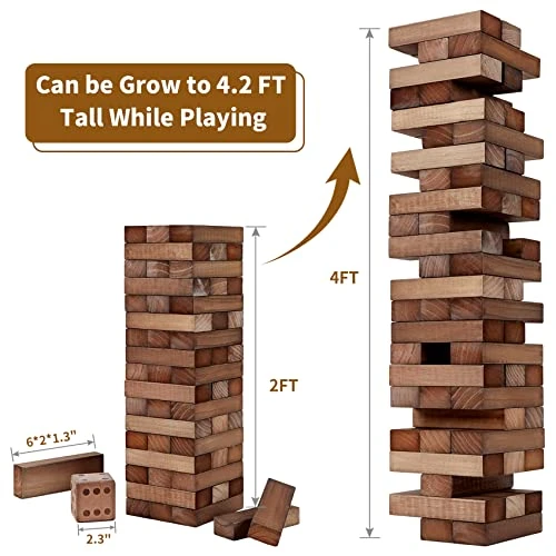 - 【Perfect Gift & 100% Satisfactory】The Classic Wood Stacking Games set is a perfect gift for your Friends, Family. Great group indoor or outdoor game for Parties, BBQ’s, Tailgating, Group Events, Wedding, Camping and much more, the Timber Tower Set can be a staple to your leisure time! We offer 24-hour customer service and 30-day return. Any questions, please feel free to contact us!