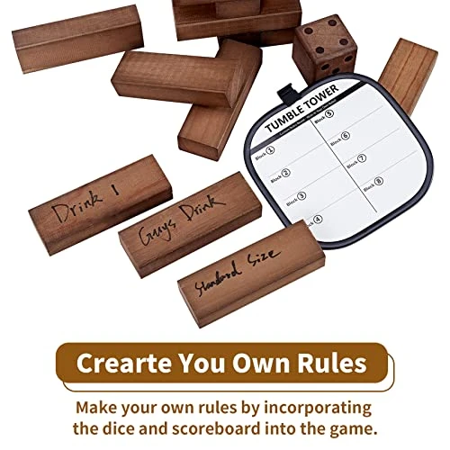 - 【Perfect Family Game & Group Party】Our Giant Timber set is easily for people of all ages to play, including Teens, Adults, Family. Parents can get timber for Back Yard fun. It’s the best family activity spans the age gap. You can personalize the set and gather round your friends to play with it. With Scoreboard, Marker Pen and Dice, make up your own rules by incorporating the Dice,White Scoreboard,Marker Pen into the game. No complicated and easy to play for everybody.