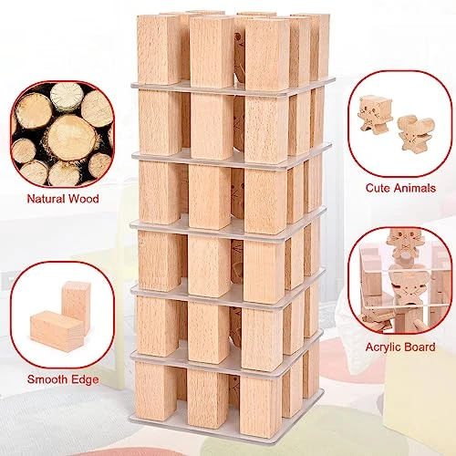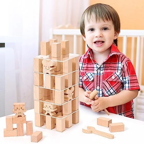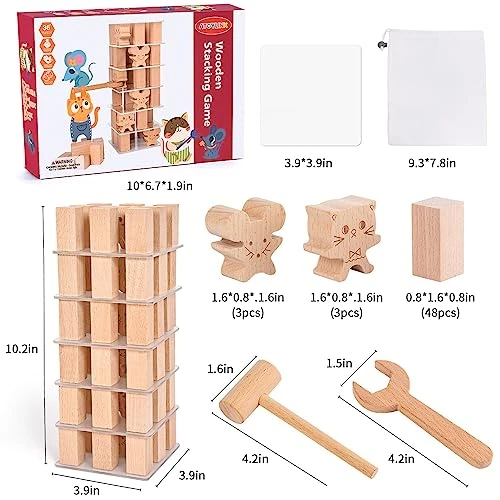 - Ways to Play – Build the tower and players will take turns to remove one block. Keep it balanced, the player who knocks down the tower is the loser. Meanwhile, rescue the mouse and cat in the stacking tower by wooden tools. Also our blank stacking blocks to write on can be an alternative of domino shows or wooden arts & crafts.