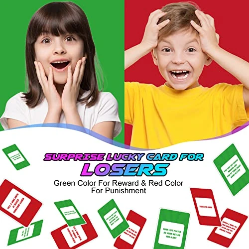 - 🤣 50 Hilarious Cards: The family game comes with 50 lucky cards,each card has a surprise task for the loser of each round games,green color for reward while red color for punishment. These tasks are simple and funny, easy to conduct,making it a great way to regulate kids emotions when they lose and enjoy more laughs with family or friends.