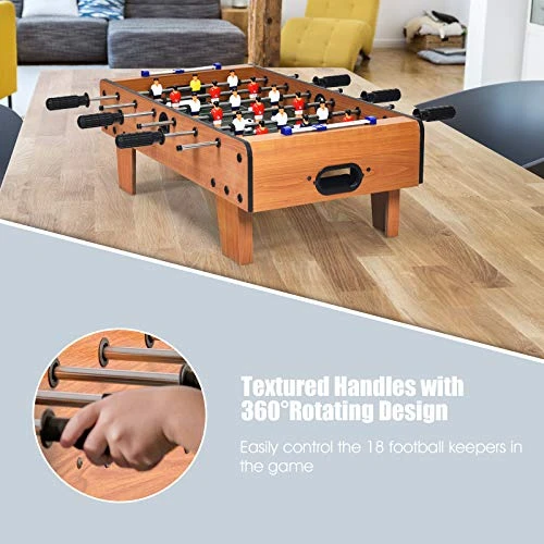 - ⚽ Stable Structure & Humanization Design–Constructed with tough board and steel rods, this mini foosball game has great stability and durability. Frictionless football pitch surface and 6 rotating rods with textured handles make you have easy control of the football and create swift shots.