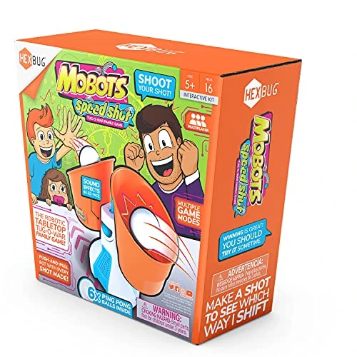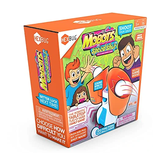 - HEXBUG Mobots Speed Shot is compliant with CPSIA standards. Ages 5 years and up. This robotic toy set is battery powered. Batteries included are AAA. With multiple game modes, lights, sounds, and movement, your family will have a blast on game night! Select from several game styles, including regular and reverse tug-o-war. 6 ping pong balls included.