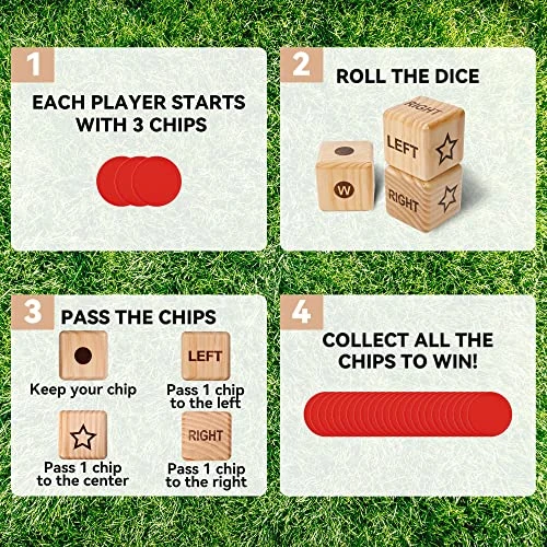 - Giant Size Dice Complete Set: Each giant left right center dice set includes 3 specialty marked dice-3.5 x 3.5 x 3.5 inches, 24 plastic playing chips- 3.5 inches diameter, a canvas storage bag and instructions. Perfect for team building activities, create your own carnival game for hours of entertainment.