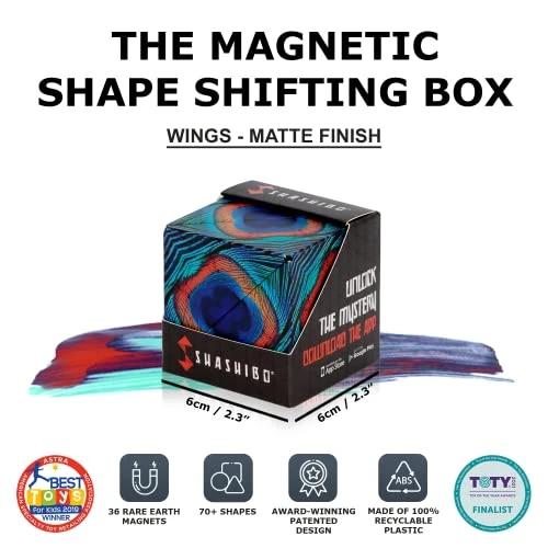 - π§ NOTHING COMPARES to the QUALITY & UNIQUE DESIGN of the Shashibo, durably constructed of PREMIUM injection-mold plastic, 36 RARE EARTH MAGNETS, and a TEAR-PROOF, matte or high-gloss surface. Each magnetic puzzle features 4 UNIQUE, ARTISTIC PATTERNS of vibrant, MESMERIZING ARTWORK, for an ever-changing array of BEAUTY AT YOUR FINGERTIPS.