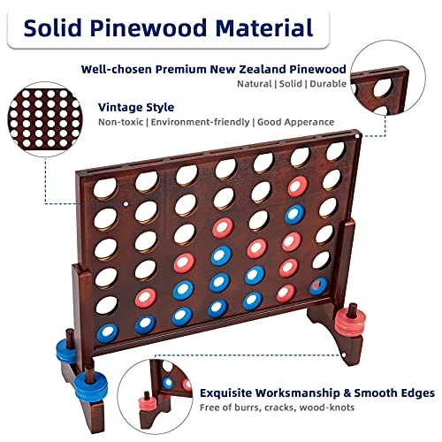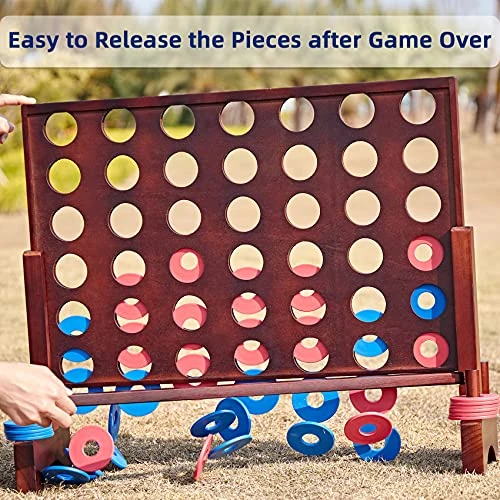 - PREMIUM MATERIALS, PRECISION WORKMANSHIP – The wooden frame of the outdoor connect 4 giant Set is crafted from quality pine wood, all components are rounded polished for burs free. The retro reddish-brown coating of the Wooden Connect 4 Game is painted with no-toxic material, bring your family the game moment of peace of mind. The discs are made from quality PE, not easy crack.