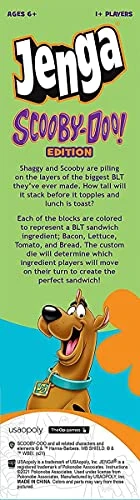 - PLAYFUL GAME: This playful game idea features the Jenga Scooby Doo edition where the player pulls tomatoes, lettuce, and bacon blocks according to the roll of the die.