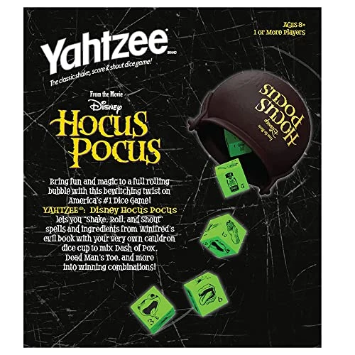 - Includes: 1 custom Hocus Pocus witch cauldron, Custom scorepads, 5 custom Yahtzee dice featuring ingredients – #1 Oil of Boil, #2 Dead Man’s Toe, #3 Newt Saliva, #4 Dash of Pox, #5 Herb that’s Red, #6 Thine own Tongue.